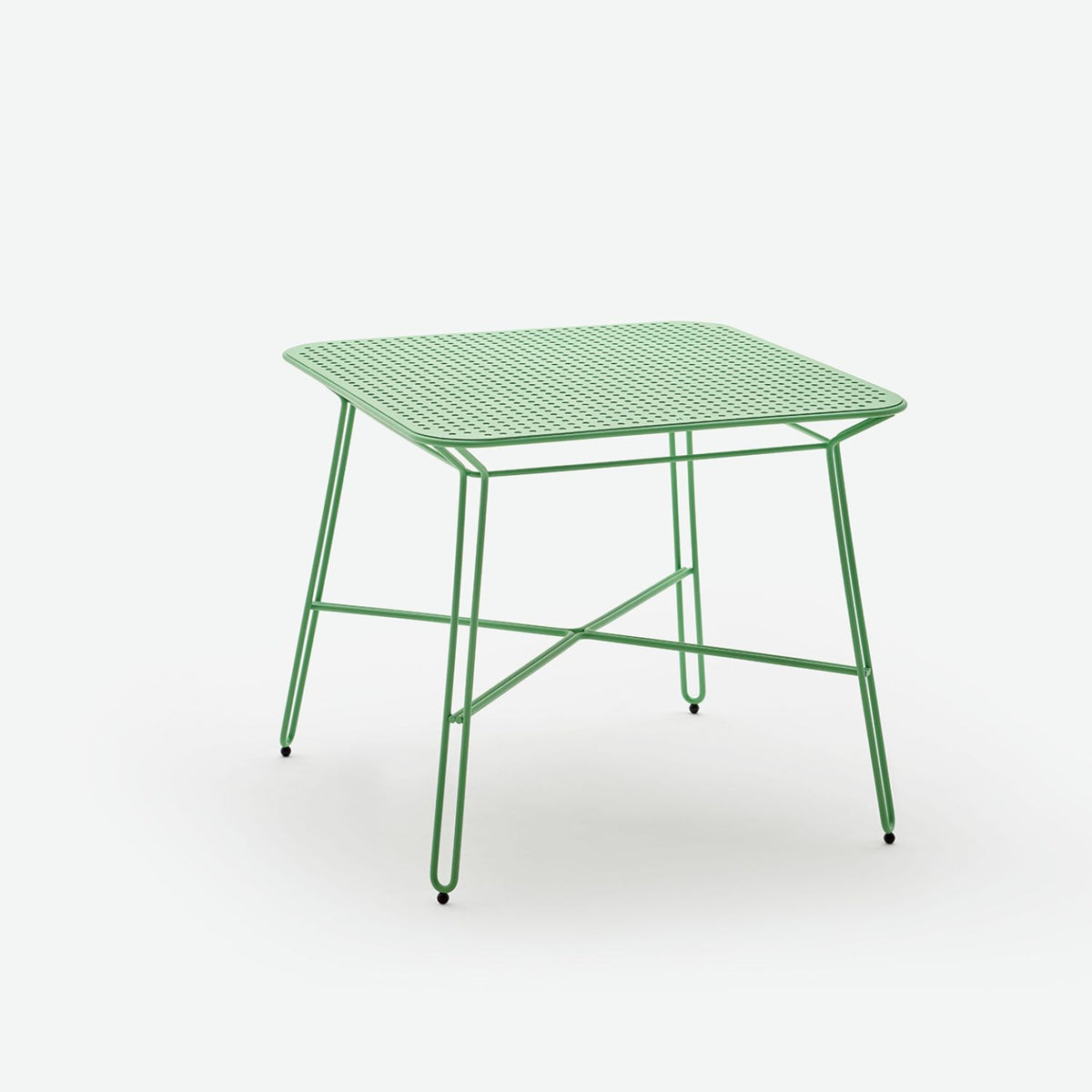 The Polka Square Café Table measures 33.5 square inches and is 29.5 inches tall, a perfect fit with standard dining chairs. Choose from 30 delicious UV-stable powder coat colours. Featured here is the Polka Square Cafe Table in Pale Green.