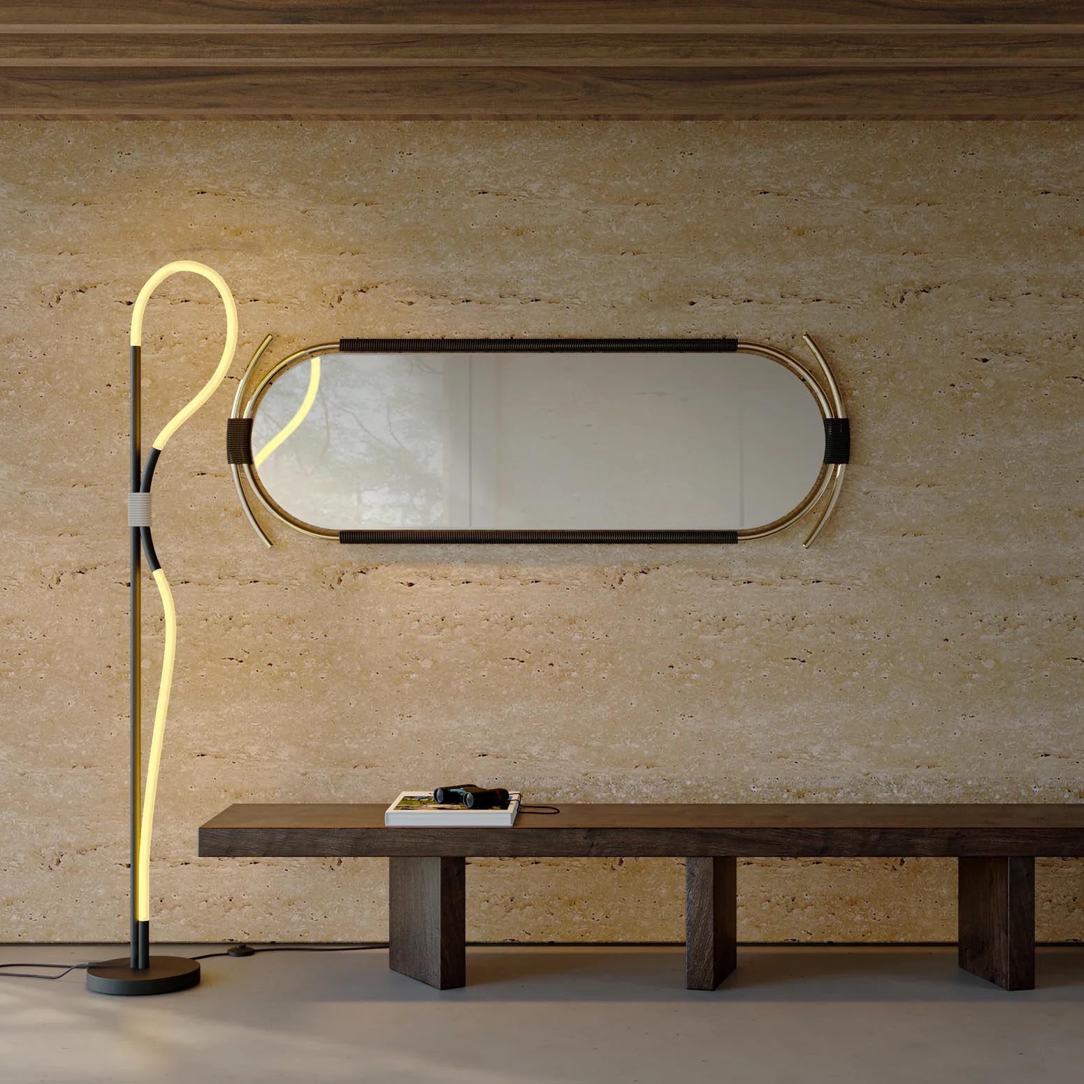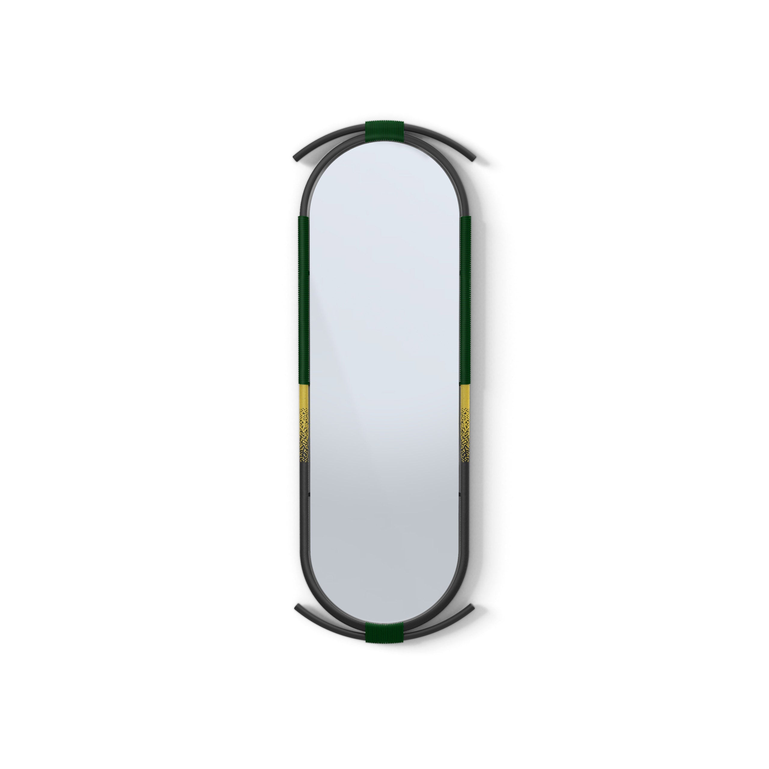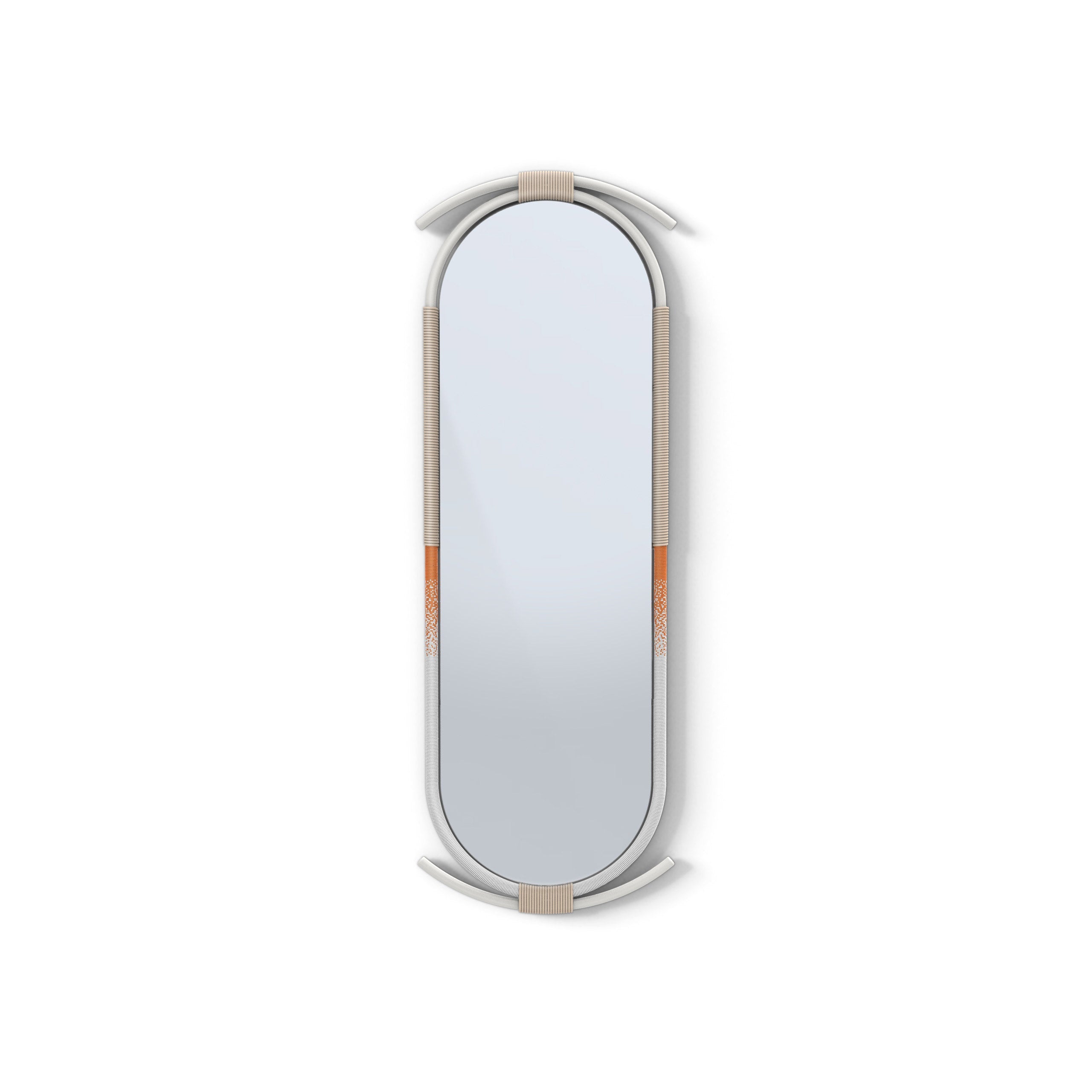 The sculptural frames take elements of African craft and design into a scale fit for a modern living space each with its own unique silhouette. Each frame is 1" (25mm) in thickness and is hand wrapped with cord, beads or leather intertwined in a dance around the mirror.
