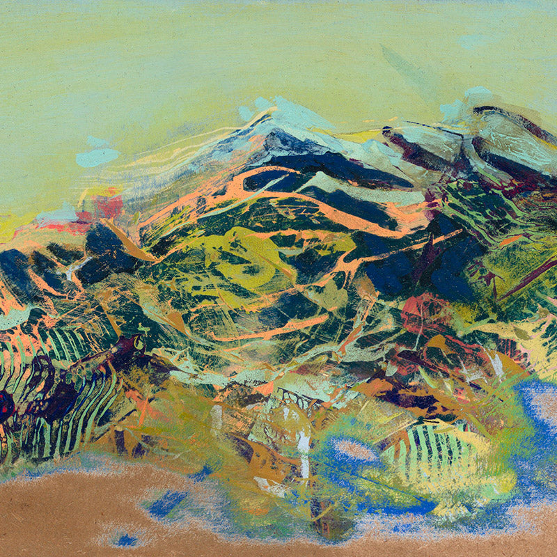 Golden Gate Blue by Michelle van Reenen offers a more dramatic interpretation of the Golden Gate landscape, where memory sharpens and the edges of the mountains become bolder, more defined. The textured layers of colour build a sense of weight and intensity, transforming the once-floating forms into something striking. Inspired by the emotional charge of a remembered journey, this painting explores how landscapes can imprint deeply—becoming symbols of awe, drama, and the power of nature to both anchor and unsettle us.
