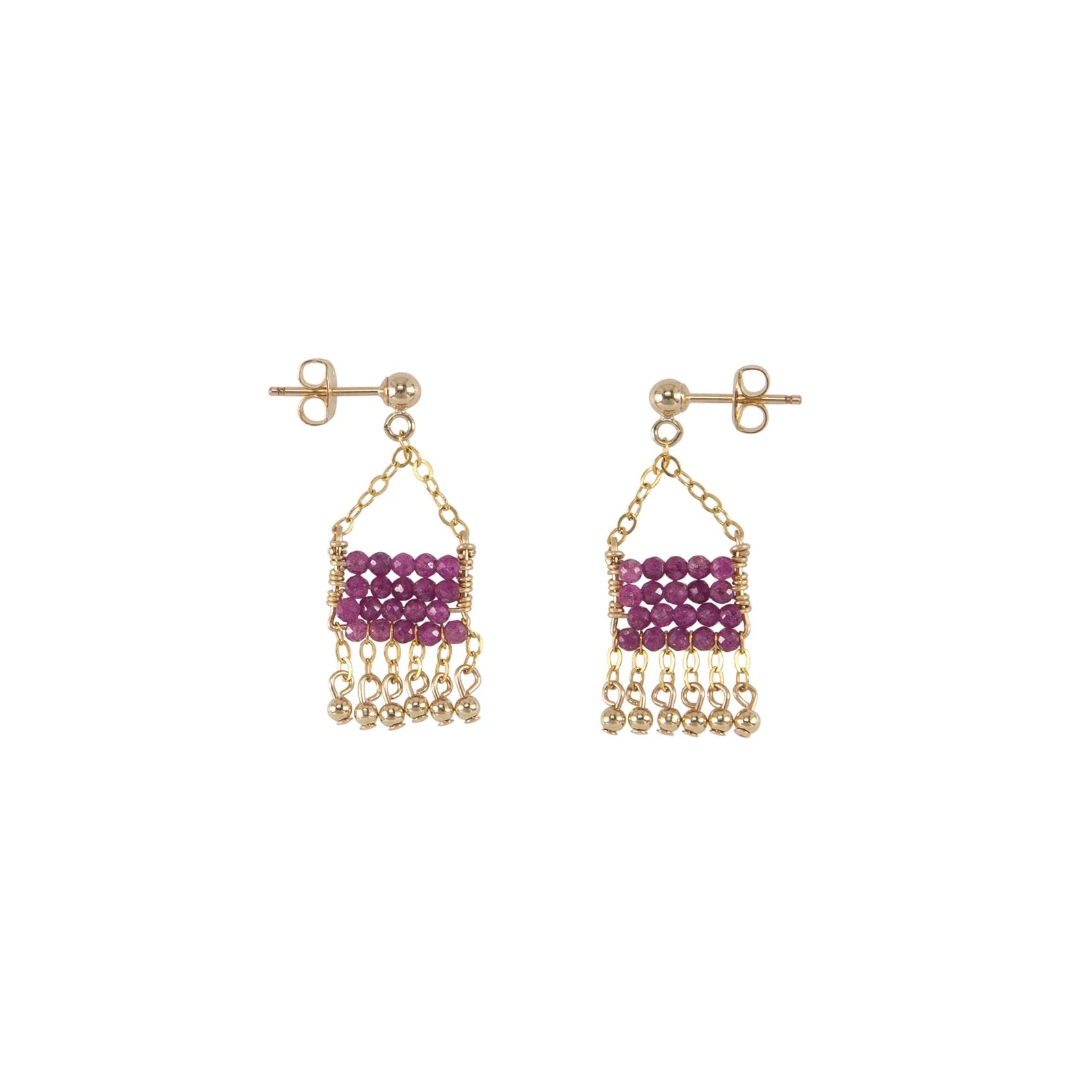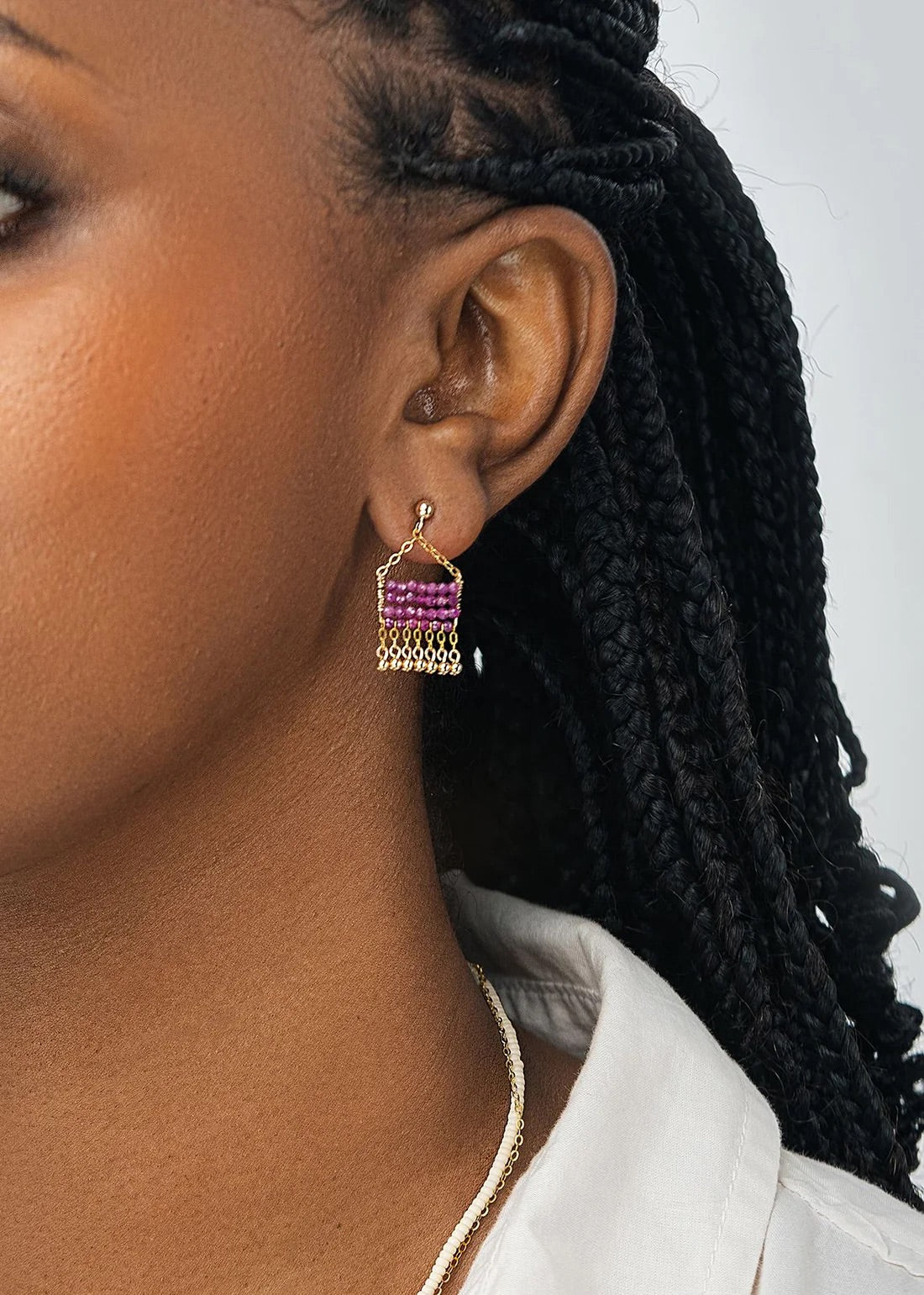 Beaded pendant earrings made with ruby beads and a block of 14K gold filled beads, adorned with 14K gold filled chain tassels. Our gemstones are genuine and naturally formed so colour may vary. Stones size: 2mm Secure with a 14K gold filled butterfly closure and ball post.