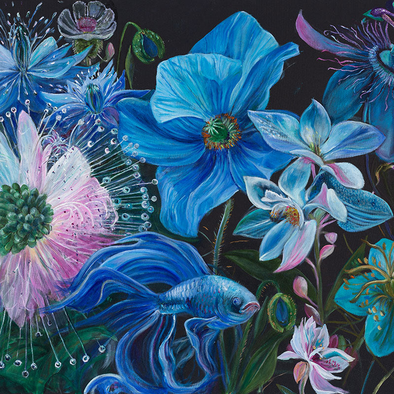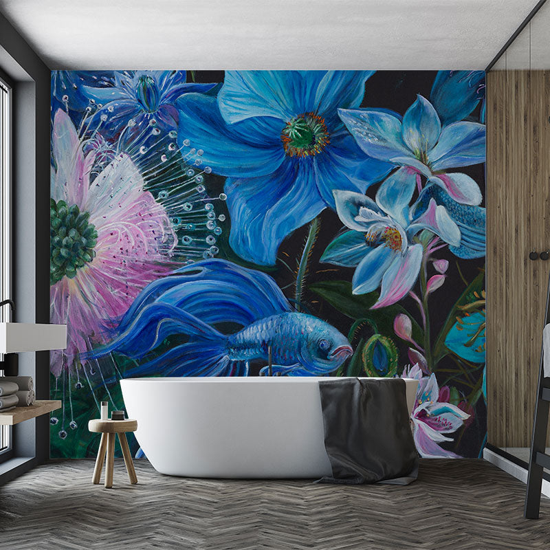 Under Water by Amelia Mariella is a captivating oil painting that blends the worlds of sea and garden, where fish drift gracefully among blooming flowers. This dreamlike composition captures a sense of mystery and wonder, immersing the viewer in a surreal fantasy. The resulting wallpaper design carries that same ethereal energy, bringing an imaginative and otherworldly atmosphere.