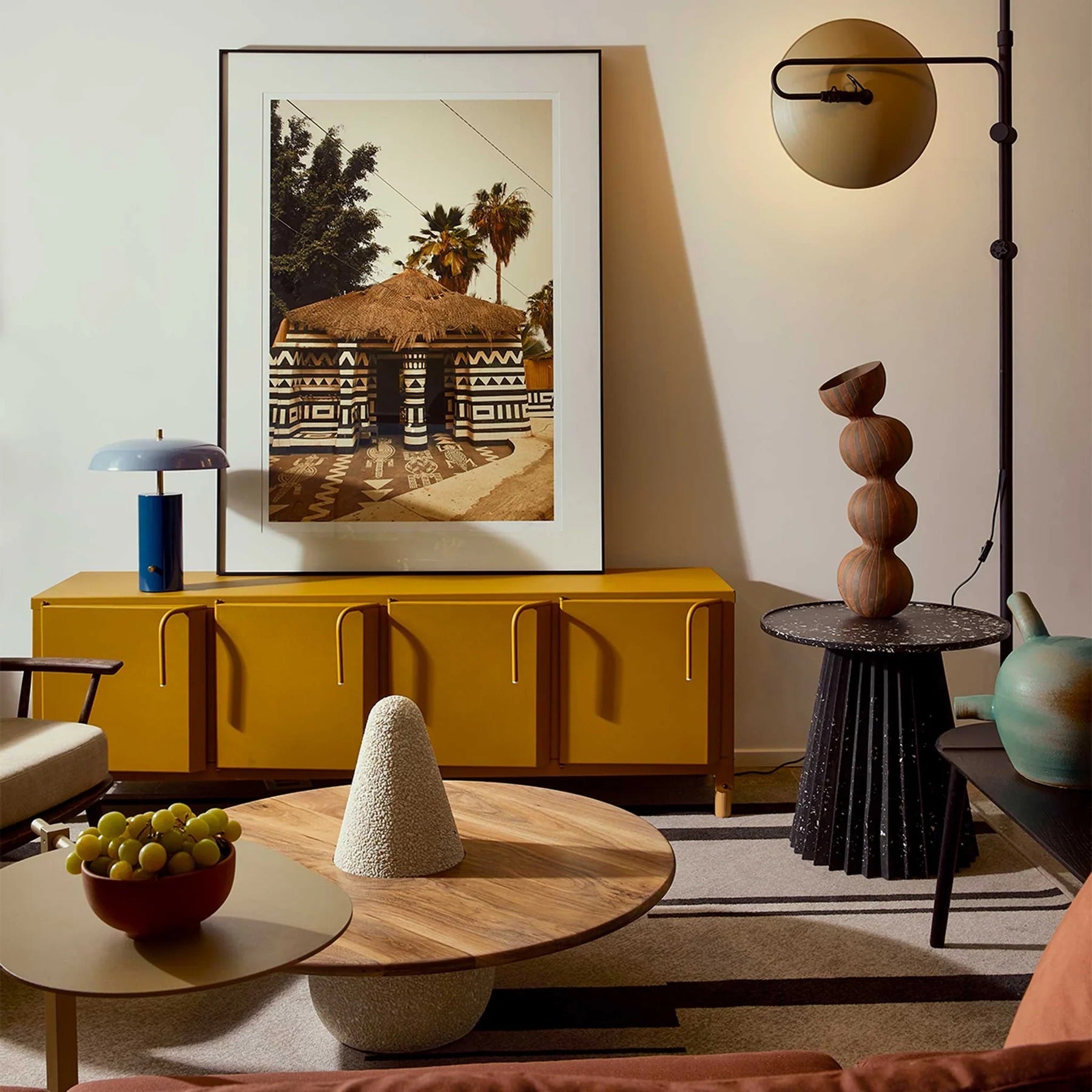 The UFO Coffee Table is a sculptural piece that blurs the line between furniture and object. A solid timber top hovers over a conical base, creating a graphic, balanced form that draws the eye without dominating the room.