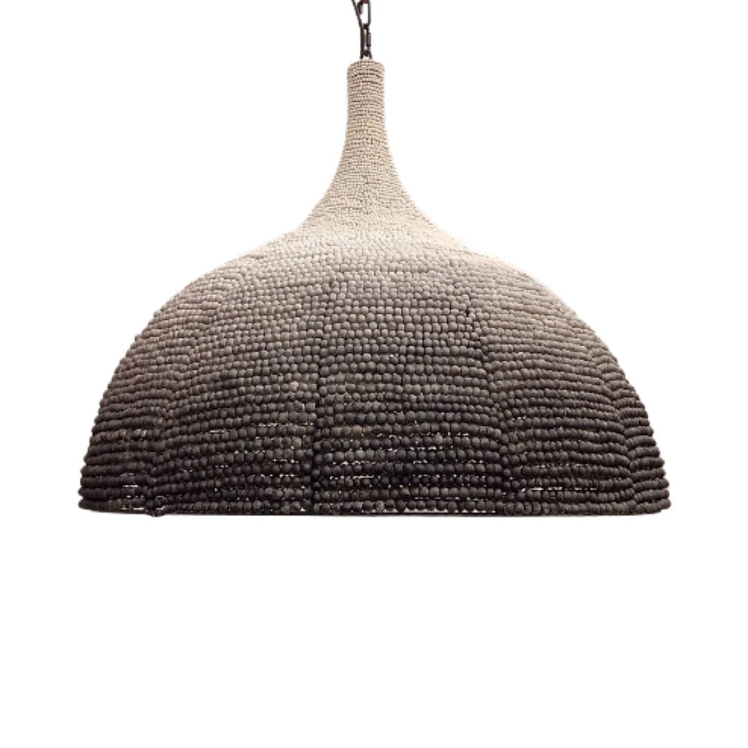 The African Dome Pendant is inspired by the traditional shape of African huts. This elegantly designed light fixture features textured rows of hand-rolled clay beads, creating a contemporary silhouette that radiates warmth and charm.