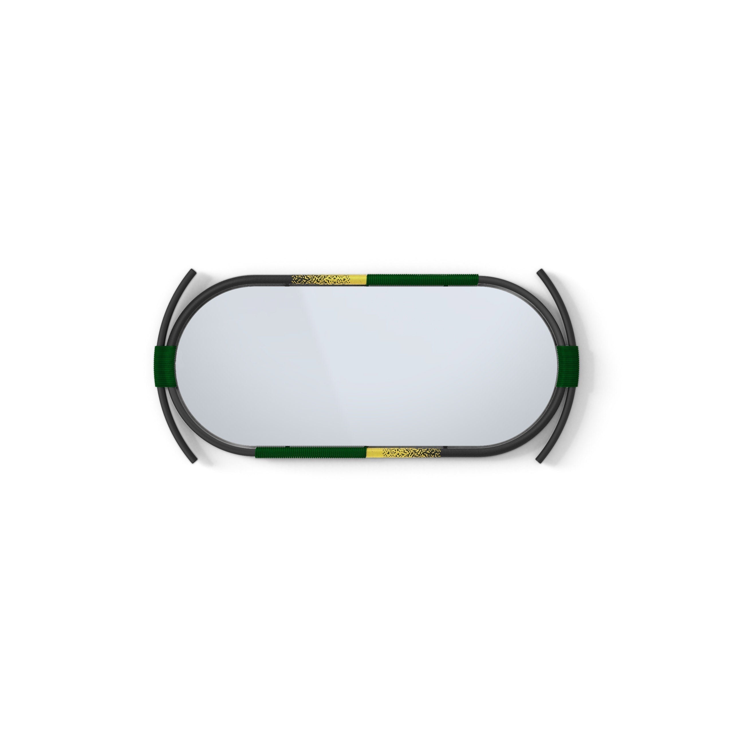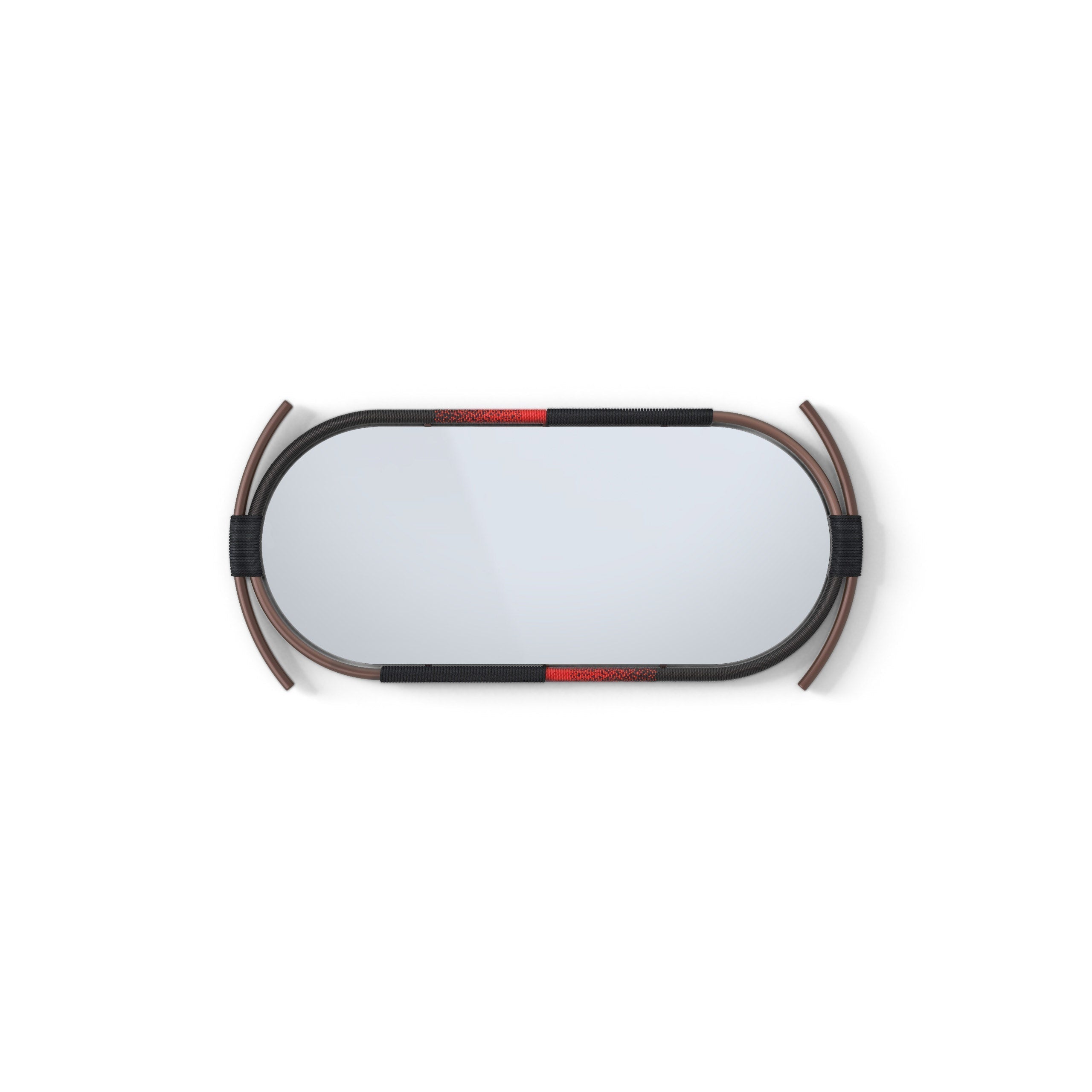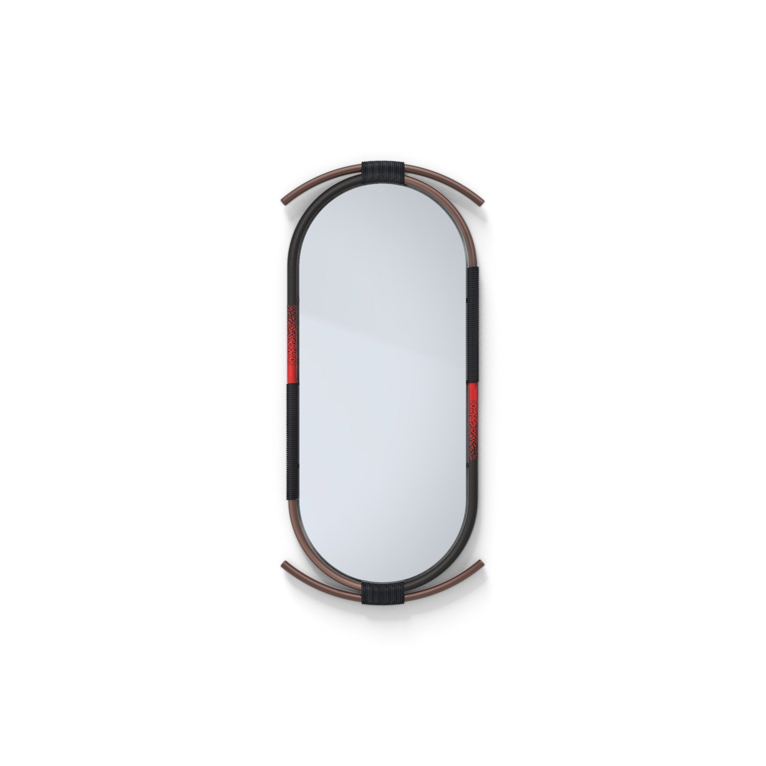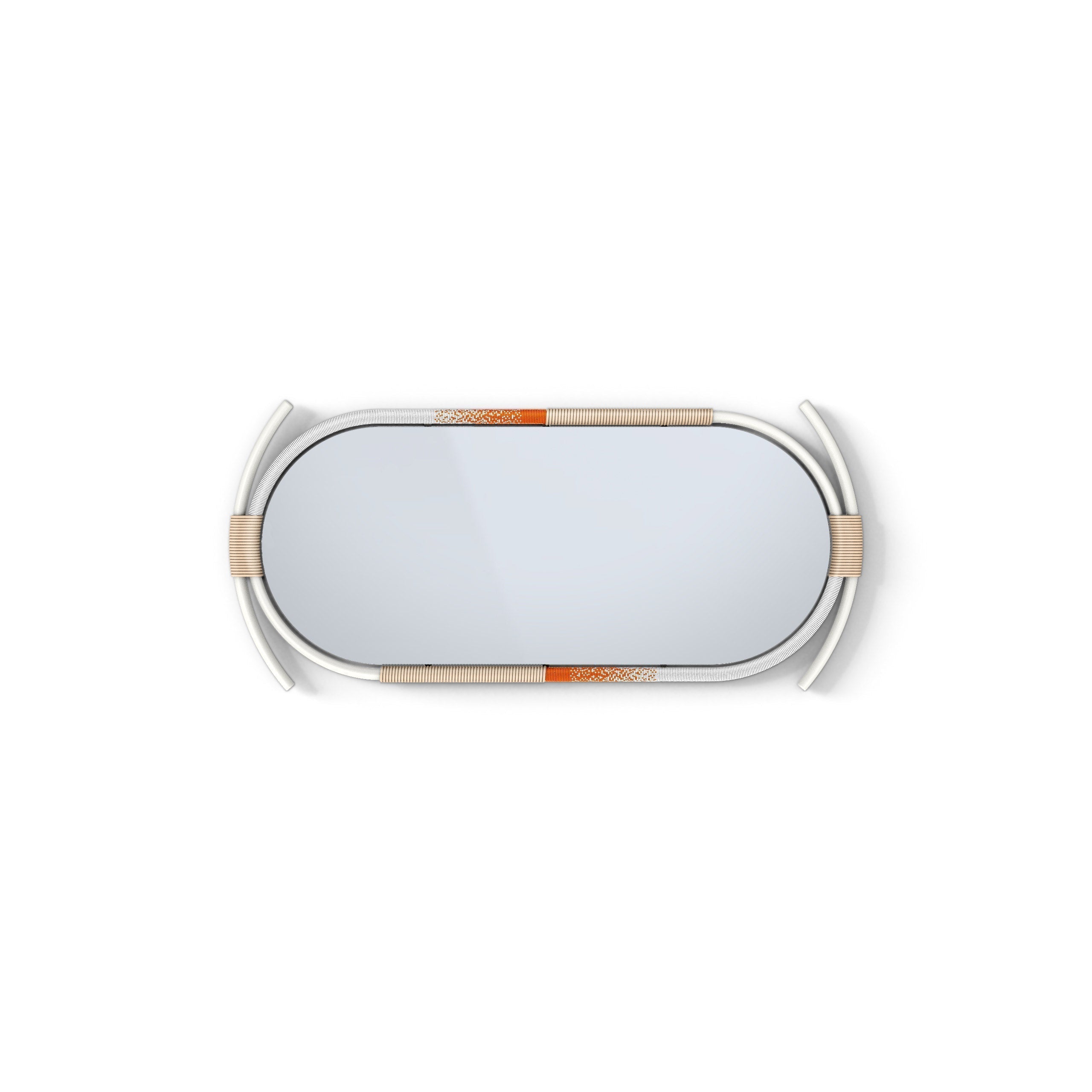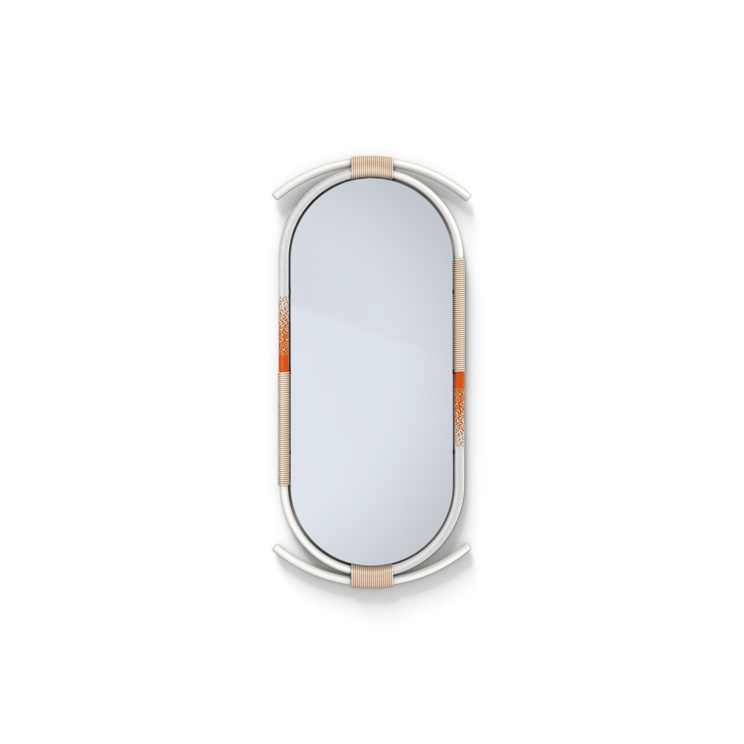 The sculptural steel frames take elements of African craft and design into a scale fit for a modern living space each with its own unique silhouette. Each frame is hand wrapped with rope and beads intertwined in a dance around the mirror.