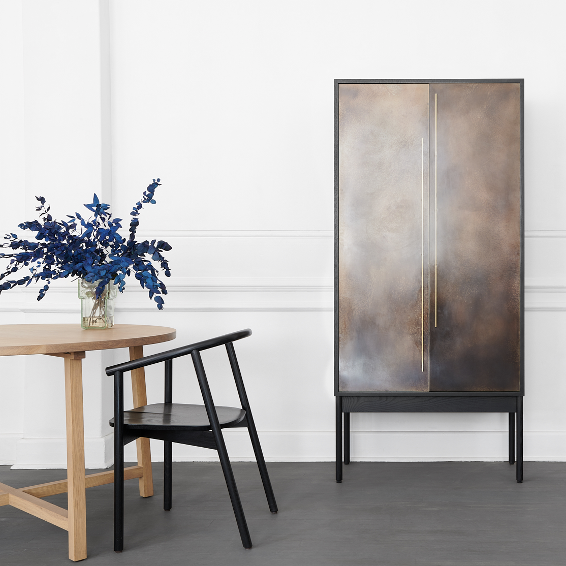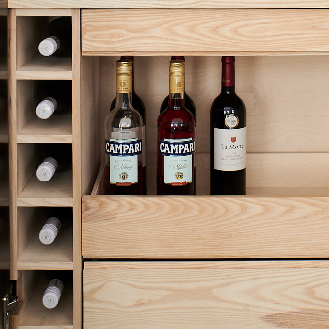 The Antique Brass covered doors and pouring shelf provide an interesting departure from solid wood whilst maintaining the material integrity of our designs. Brass is historically used in furniture and architecture and develops a worn-in patina over time, much the same as solid wood. With use, scratches, scuff marks and ring marks will appear. For us this forms part of the warmth and charm of the antiquated brass finish, reminiscent of country hotel bar-counters. Kindly note that the Brass finish is done by hand and patterns & tonal variation will all be unique.