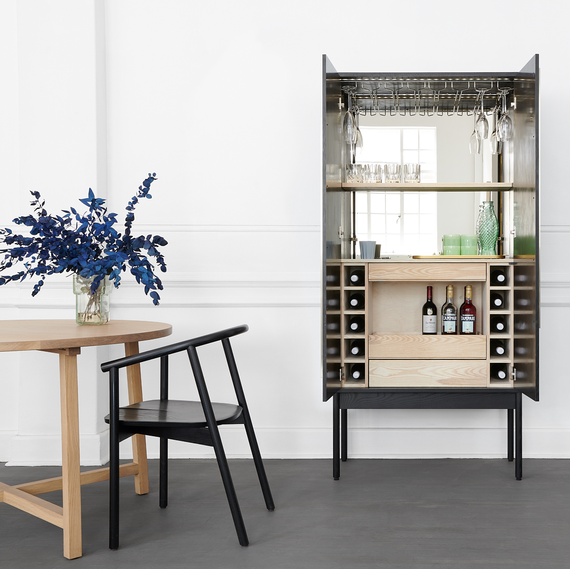 The internal configuration includes hanging racks for wine glasses; drawers for additional glasses, bottles of spirits, napkins or odds and ends; an adjustable height shelf for tumblers, a bronzed mirror back panel and interior lighting which is activated by the opening of the door.
